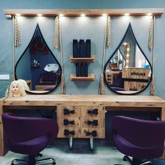 Fonksiyonel ve estetik kuaför tezgahları, aynalı çalışma üniteleri ve styling istasyonları.